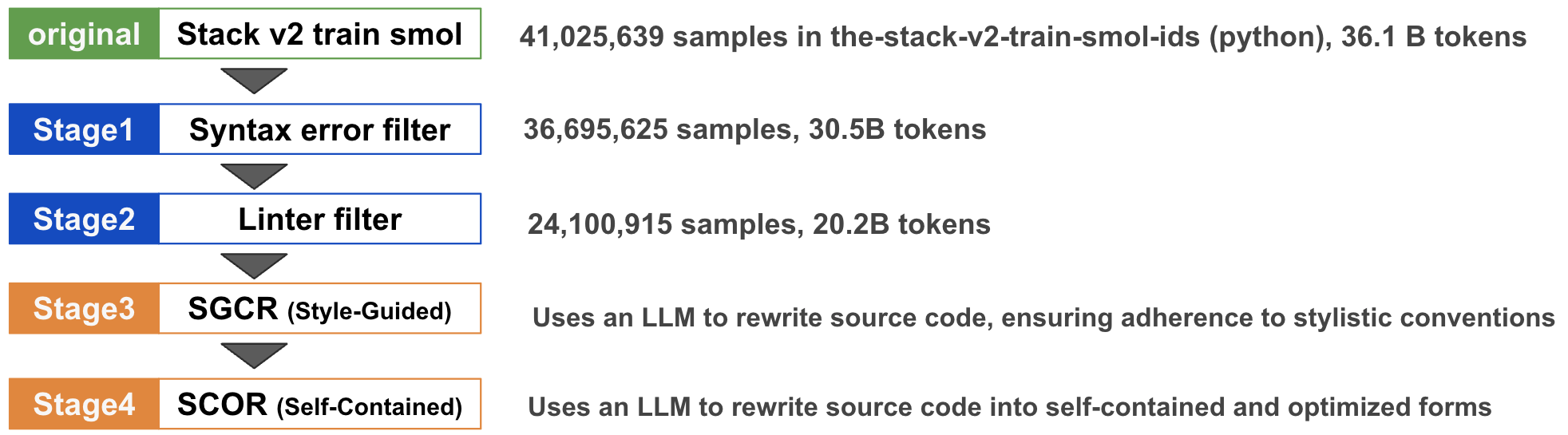SwallowCode-v2 introduces a fully redesigned pipeline incorporating ruff-based auto-formatting and multi-stage LLM-based quality scoring.