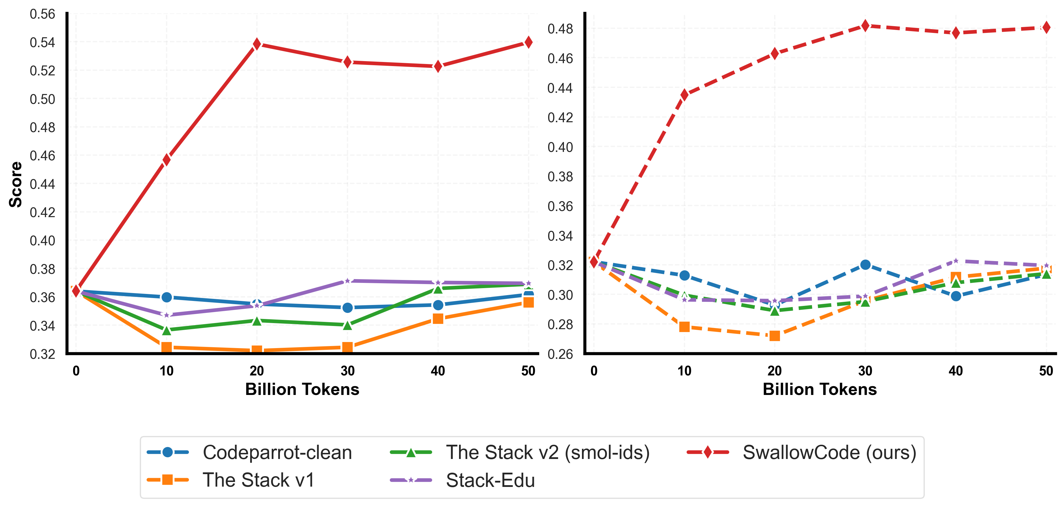 After the v1 release, we aimed to make the datasets more accessible and legally permissive, transitioning from the Llama 3.3 Community License to Apache-2.0. We also sought to expand the dataset size — since SwallowCode-v1 (16.1B tokens) and SwallowMath-v1 (~3B tokens) were relatively small for mid-stage pretraining. Our target for v2 was to triple the dataset size while maintaining or improving quality through refined corpus selection and rewriting.