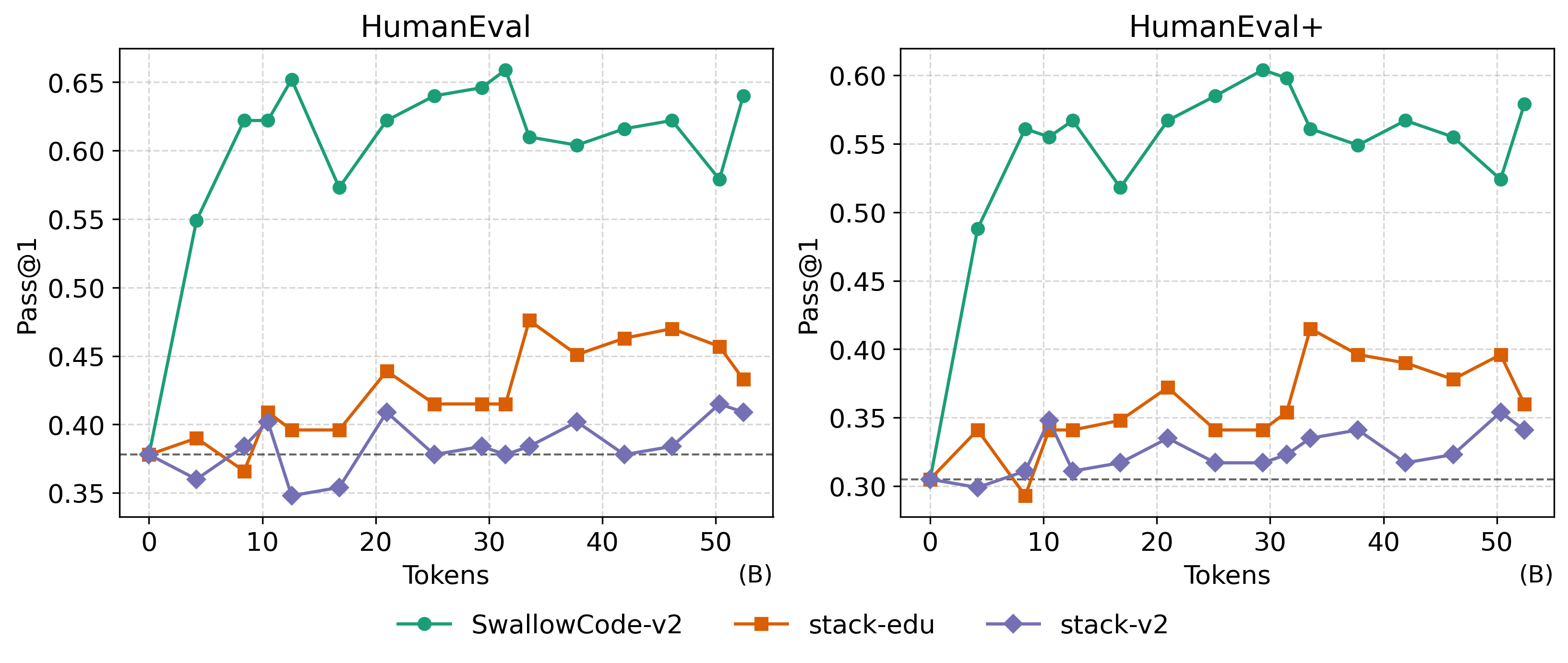 In the Swallow Project, we continued pretraining Qwen3-8B-Base on SwallowCode-v2 and its derived SwallowCode-v2 QA dataset. No degradation in HumanEval/HumanEval+ performance was observed, suggesting that SwallowCode-v2 maintains high enough quality for mid-stage pretraining of models at the Qwen3 performance level. We plan to release the full implementation of the dataset pipeline and the QA-augmented variant in future updates.